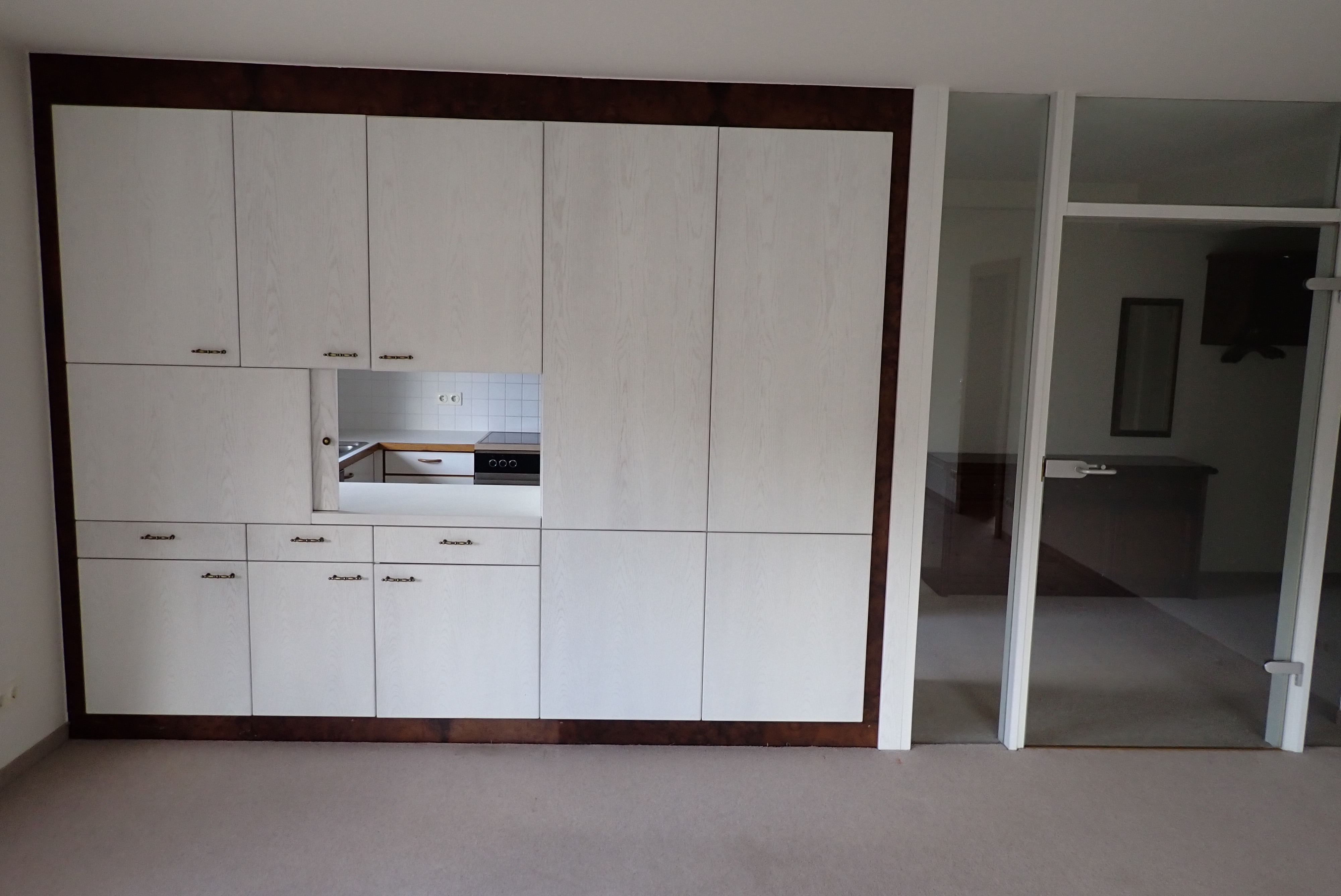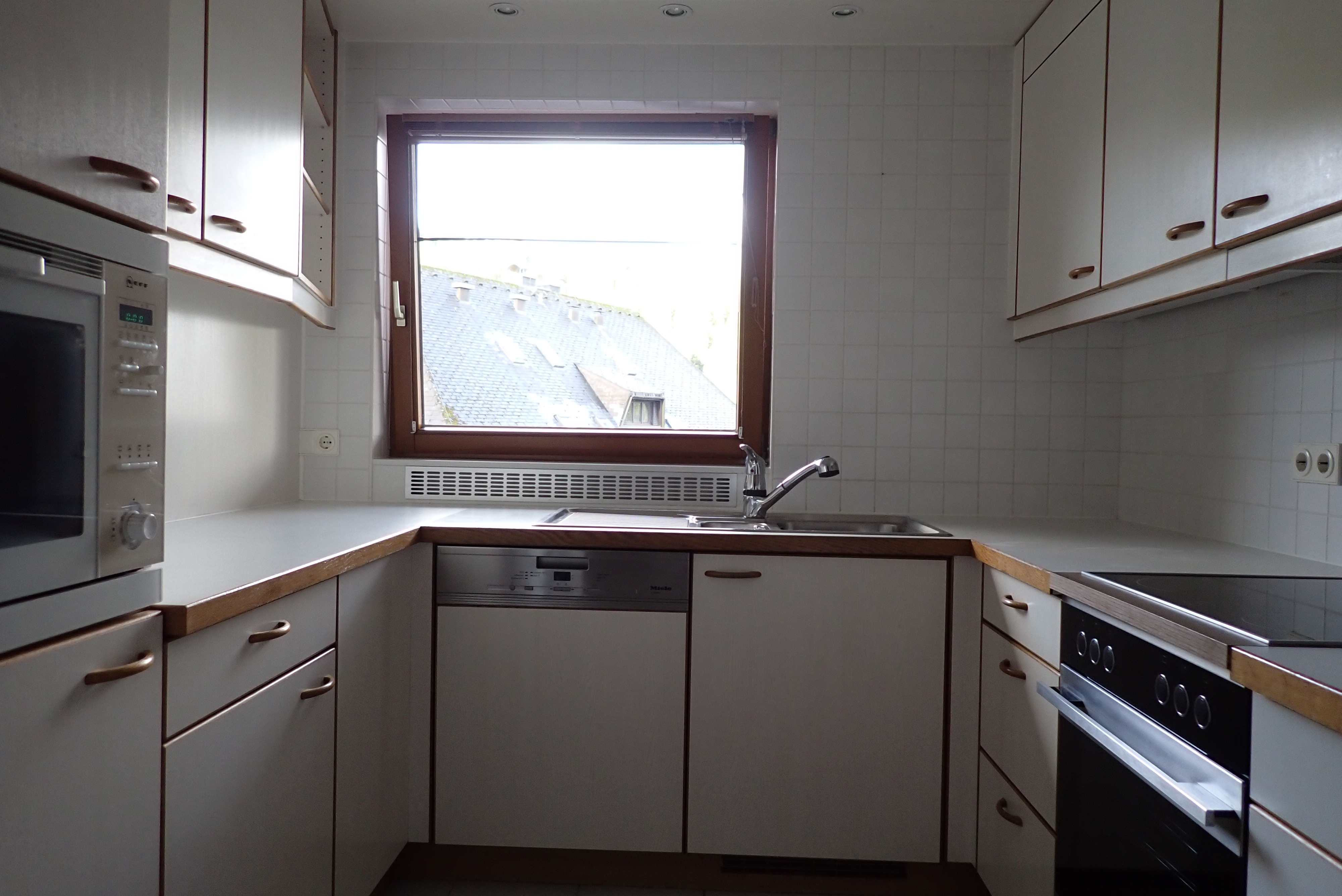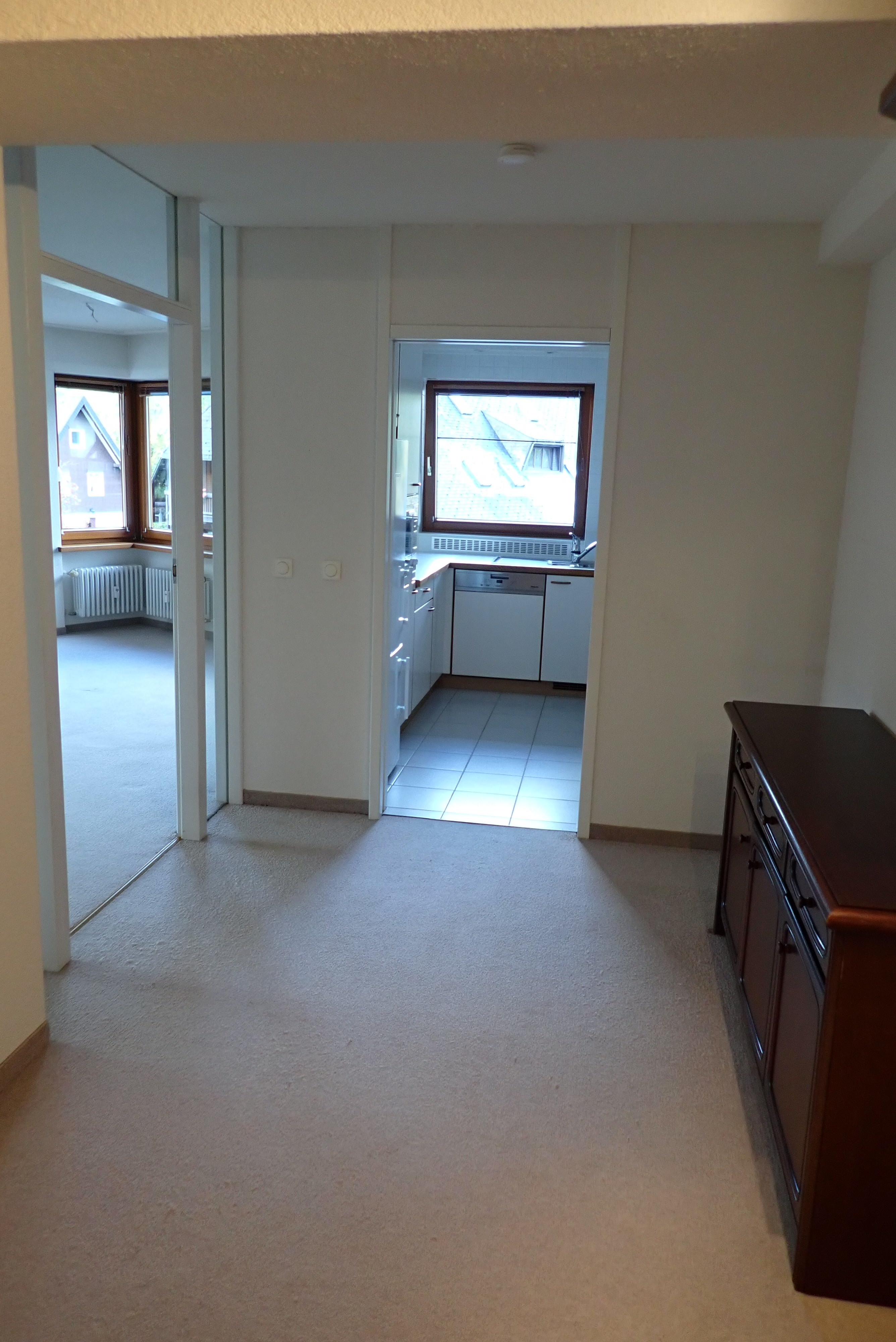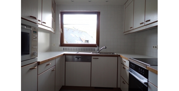 Eine weiße Markenküche mit hellen Arbeitsflächen wird vom großzügigen Flur aus betreten. Zwischen Küche und Wohnzimmer kann man das Geschirr, Besteck etc. und die Mahlzeiten über eine "Durchreiche" nach beiden Seiten bequem übergeben.