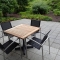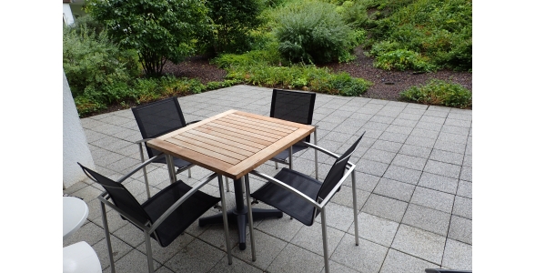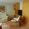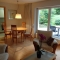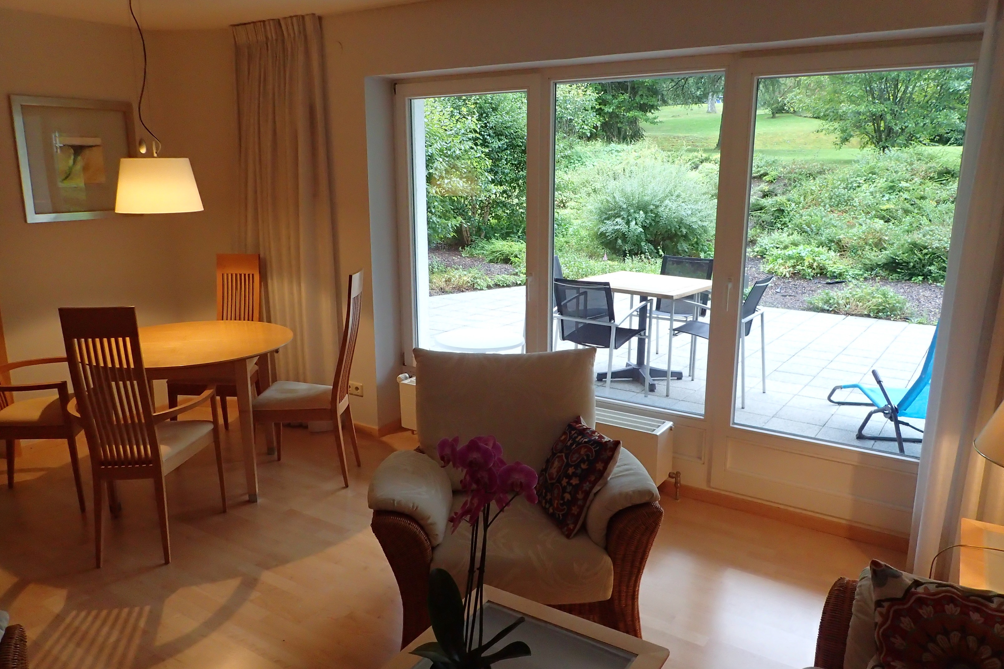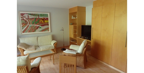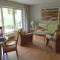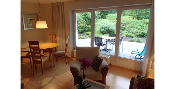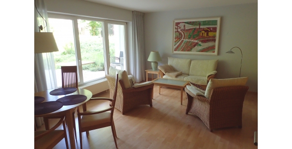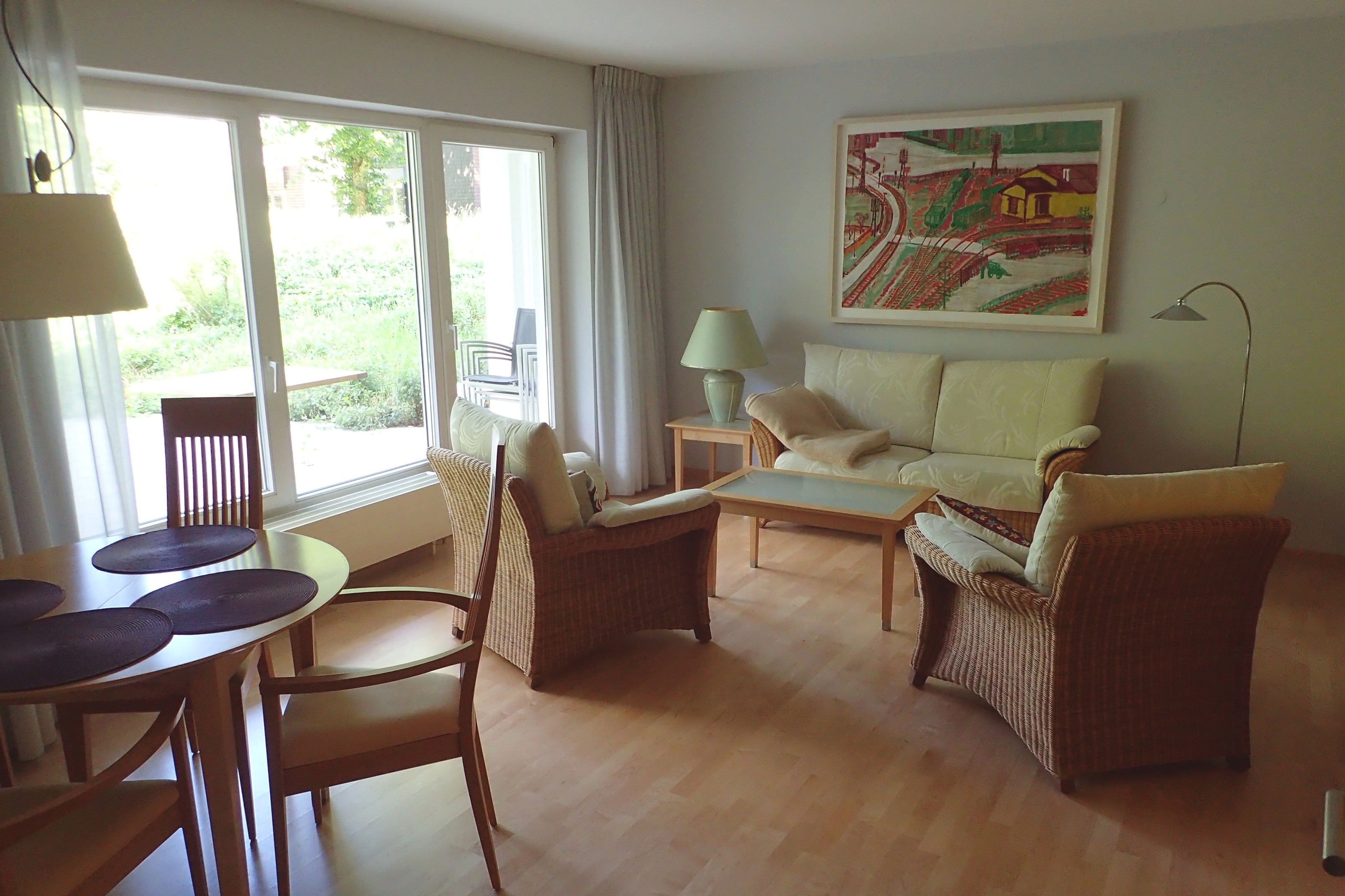 Im lichtdurchfluteten WOHNZIMMER mit großer Fensterfront und Glastür zur großen Terrasse befinden sich eine helle Wohnwand mit einem Wandschrankklappbett sowie eine Sitzecke mit zwei Sesseln und einem Sofa aus Korbgeflecht. Die Essecke mit ausziehbarem Esstisch und 4 Stühlen steht neben dem Zugang zur Küche.