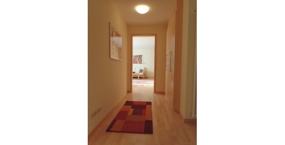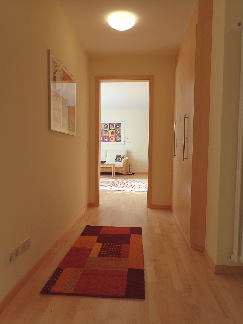 Alle Fenster der Wohnung sind mit elektrischen Jalousien ausgestattet. Die Wohnräume und der Flur sind mit hellem Fertigparkett ausgelegt.