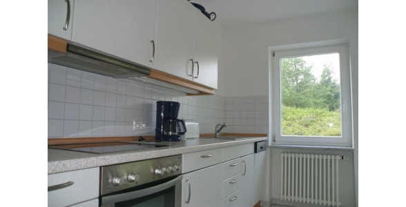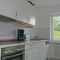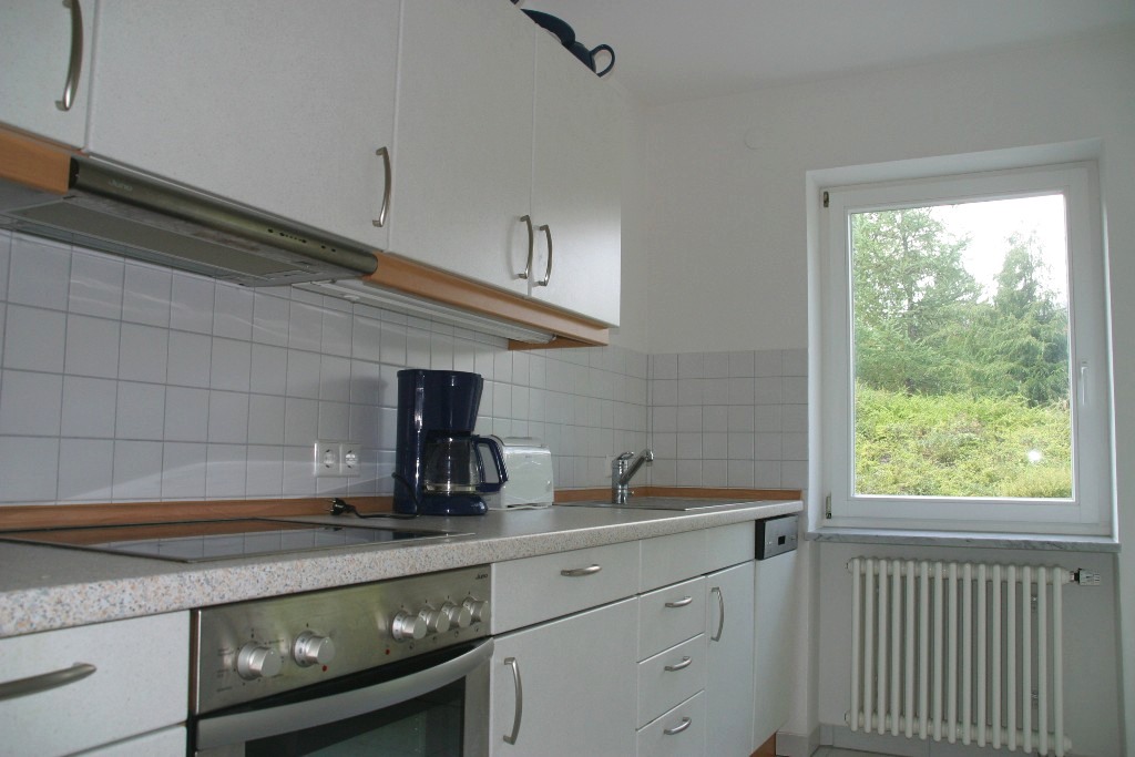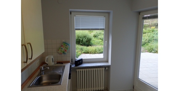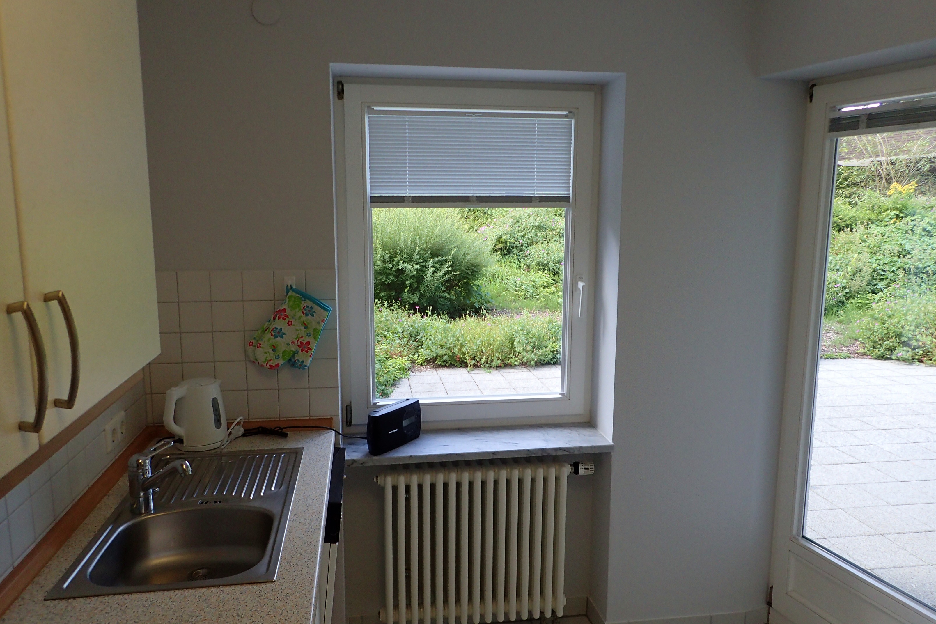 Die separate EINBAUKÜCHE mit hellen Möbeln und Fliesen ist komplett mit Geschirrspüler, Backofen, Cerankochfeld, Mikrowellenherd etc. eingerichtet und hat ein Fenster sowie eine Glastür zur Terrasse.