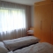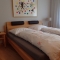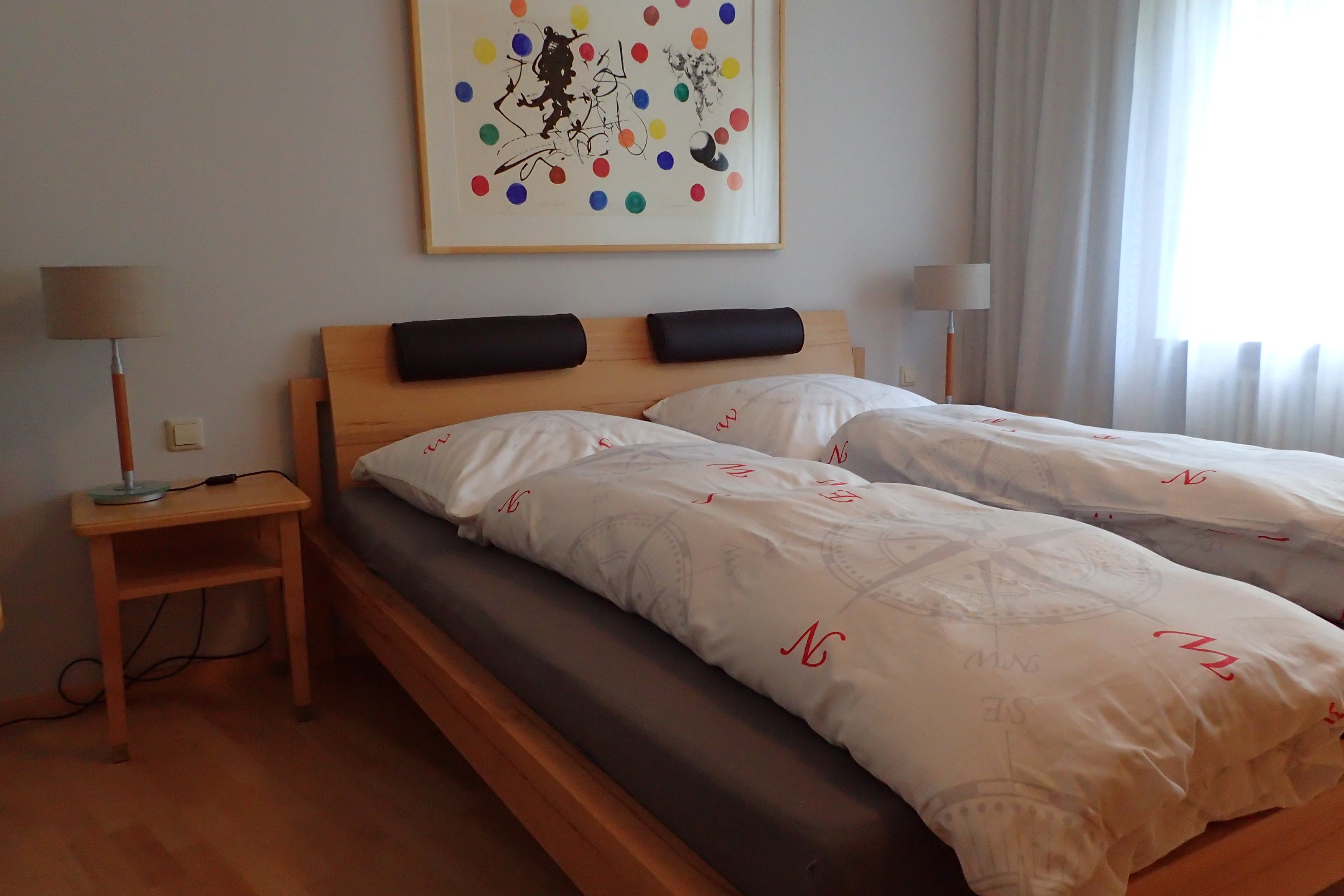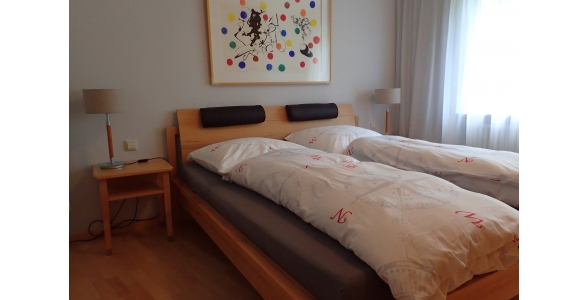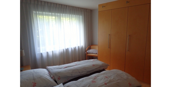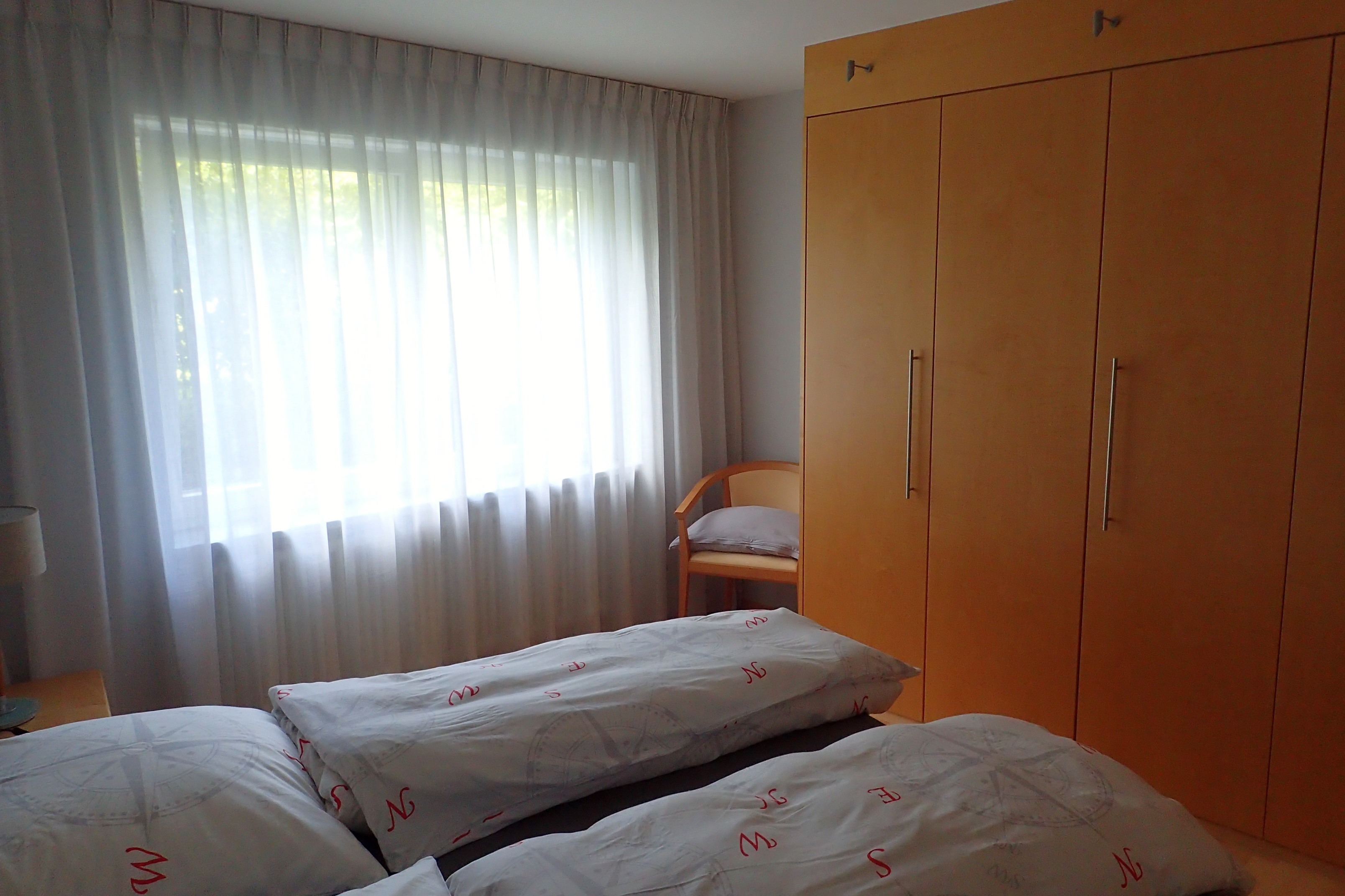 Das helle, sehr ruhige SCHLAFZIMMER mit neuwertigen Betten verfügt über reichlich Schrankplatz und ein breites Fenster zur Terrasse.