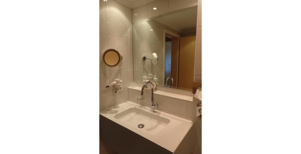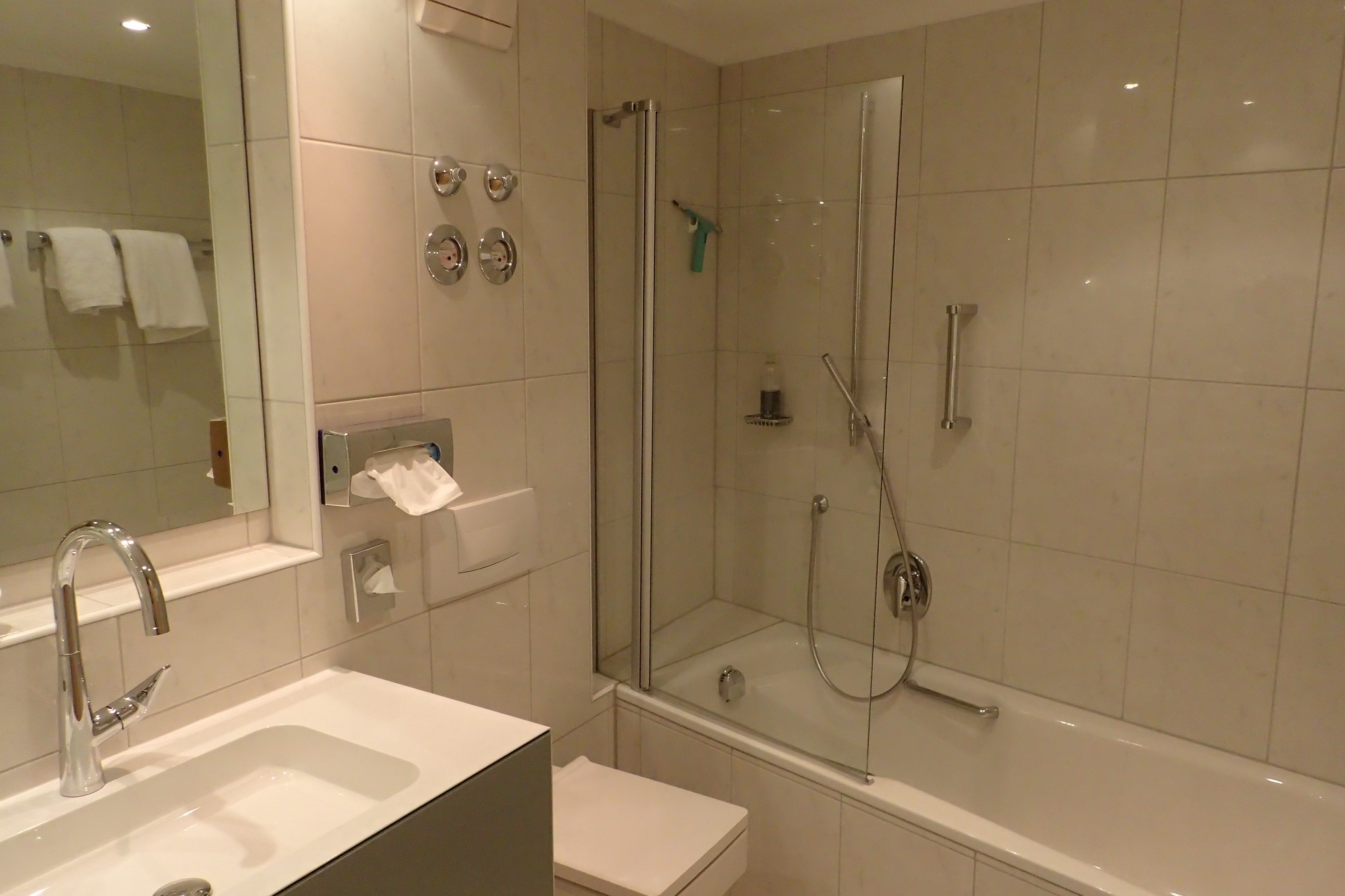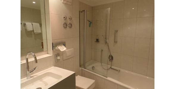 Das modernisierte BAD mit Wanne/Duschabtrennung, WC und Waschbecken ist hell gefliest.